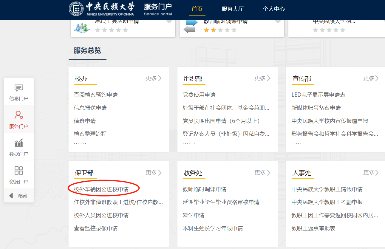 申请人登录服务门户⇒保卫部⇒校外车辆因公进校申请⇒填写申请信息⇒根据业务类型提交院领导审核⇒保卫处审批。