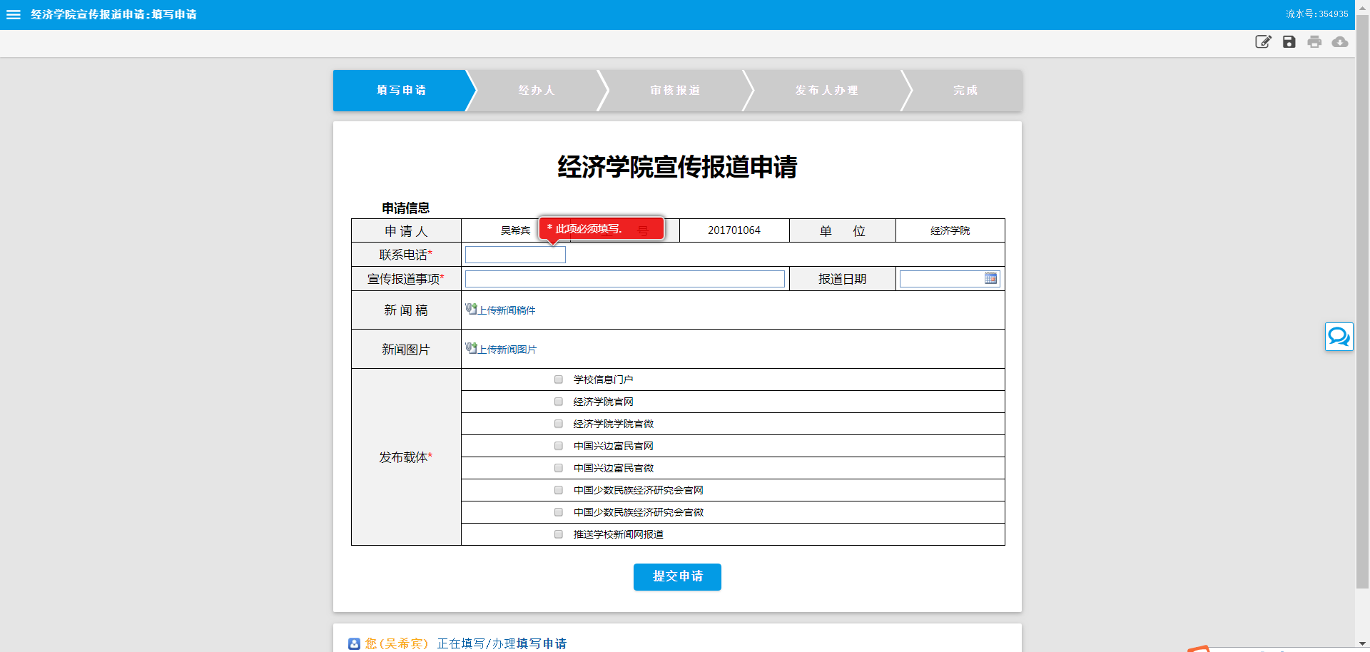 申请人登录服务门户⇒william威廉中文官网⇒学院宣传报道申请⇒填写申请信息⇒学院经办人受理⇒院领导根据业务类型审批⇒分配发布人发布。