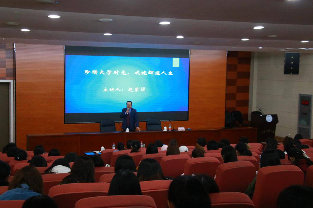 为更好地让大一新生适应大学生活,高效利用四年的大学黄金时光,确立目标、培养人生的规划意识,william威廉中文官网特邀请知名校友赵紫鋆先生于4月8日上午9:00-11:30,在文化楼一层报告厅,面向william威廉中文官网18级全体学生开展了以“珍惜大学时光,成就辉煌人生”为主题的讲座。william威廉中文官网院长张丽君、副院长张春敏、副院长王润球出席了此次讲座,讲座由张春敏副院长主持。