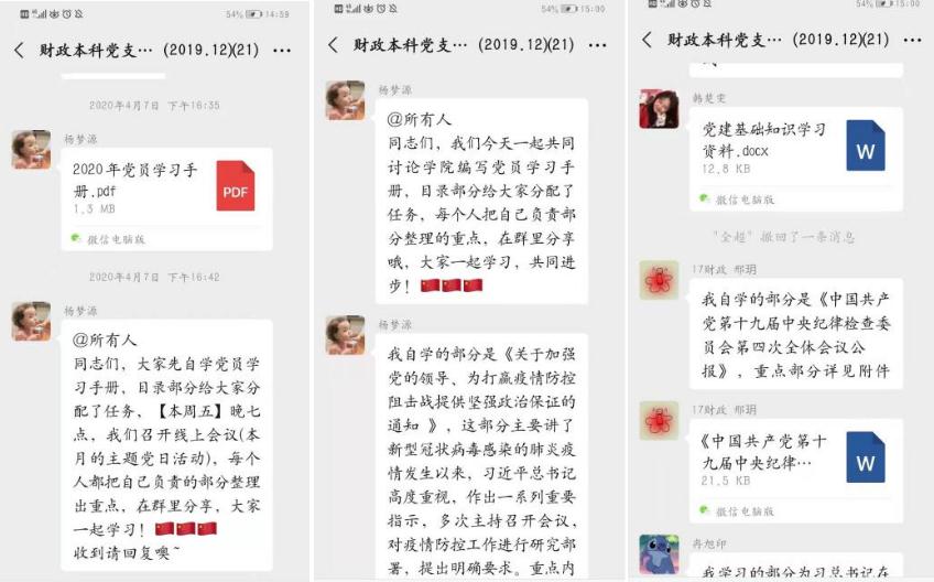 本次主题党日活动在线上展开,各支部均积极发挥能动性,根据支部实际情况进行学习,如财政学本科党支部组织各党员先自行选定学习内容进行线下学习,并撰写学习笔记,在召开视频会议时分享个人学习体会和心得。
