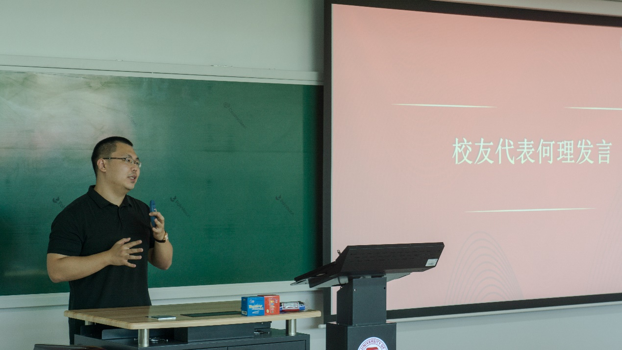 北京止于至善投资管理有限公司总经理何理作为校友代表发言。他结合自身求学、工作经历,和大家分享了《不要做茫然之潜行者》的主题演讲,强调自制力和自驱力的重要性,勉励同学们加强学习沟通、善于择友而交、培养独立意识、做到知行合一。