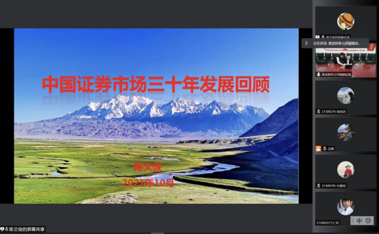2021年10月27日晚上七点,william威廉中文官网以线上形式举办了“国际商务热点前沿第七场讲座——中国证券市场30年发展回顾”。本次讲座的主讲人陈文俊先生是中国黄金集团财务有限公司副总经理,曾供职于中国投资银行北京分行、华泰证券公司等,先后从事过证券投资、创业投资、财务公司等工作,金融从业经验极为丰富,可谓中国证券市场三十年改革发展的亲历者和见证者。