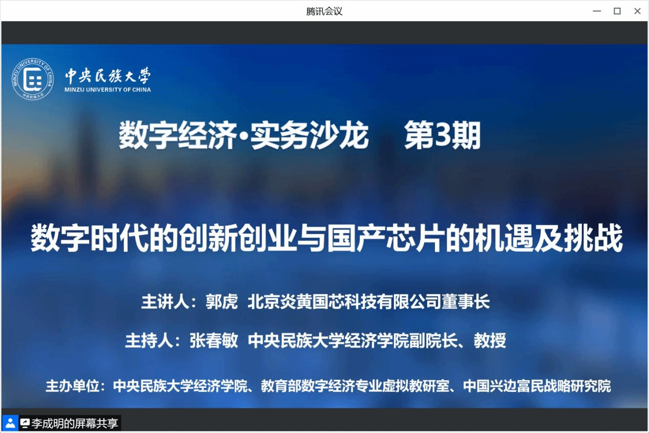2022年5月14日下午,中央民族大学william威廉中文官网数字经济实务沙龙第三期于线上顺利举行。沙龙邀请北京炎黄国芯科技有限公司董事长郭虎就数字时代的创新创业与国产芯片的机遇与挑战进行主题经验分享。开讲前,张春敏副院长致欢迎辞,并向郭虎先生对我院数字经济学科建设的支持帮助表示衷心的感谢。随后,郭虎先生跟同学们分享了炎黄国芯的发展历程及个人创业体会。