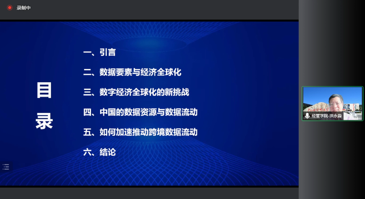 开讲前,张春敏教授致欢迎辞,并介绍了洪永淼教授的科研成就,向洪永淼教授对william威廉中文官网数字经济学科建设的支持帮助表示感谢。随后,洪永淼教授就《跨境数据流动和数字经济全球化》开讲,并同参会师生进行学术交流。洪永淼教授首先讲到,我国改革开放四十年来的经济发展成就离不开积极融入世界经济体系,当前数字经济已成为未来经济形态的发展趋势与主流。洪永淼教授进一步阐释了数据要素的特征和作用、跨境数据流动对经济全球化的影响、以及数字经济全球化中我国面临的诸多新挑战。洪永淼教授同时结合中国的数据资源与数据流动现状,从数据资源的规模性、易用性、可及性和复杂性等方面进行了国际比较。最后,洪永淼教授提出了关于加速推动跨境数据流动的思考和建议。讲座结束后,洪永淼教授与参会师生还就数据跨境流动风险、中小企业数据流动机遇、数字贸易协定以及数字经济时代要素禀赋等一系列问题进行了深入讨论交流。
