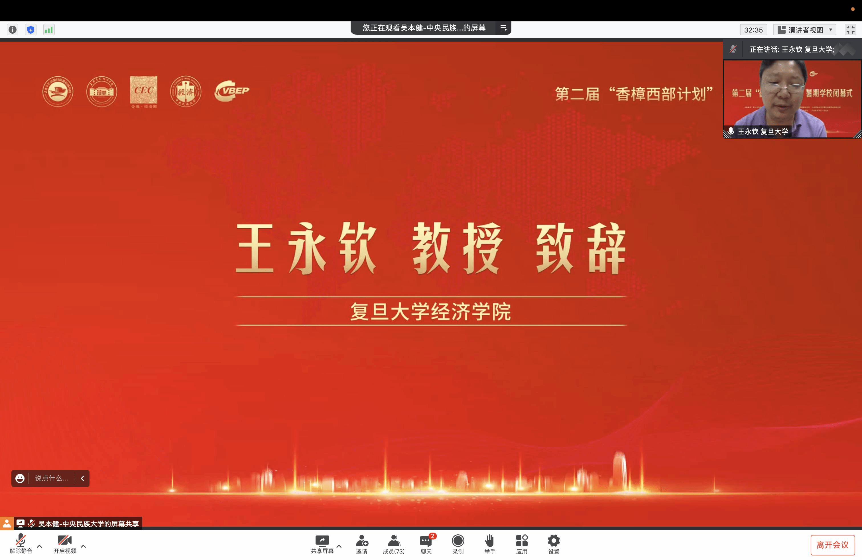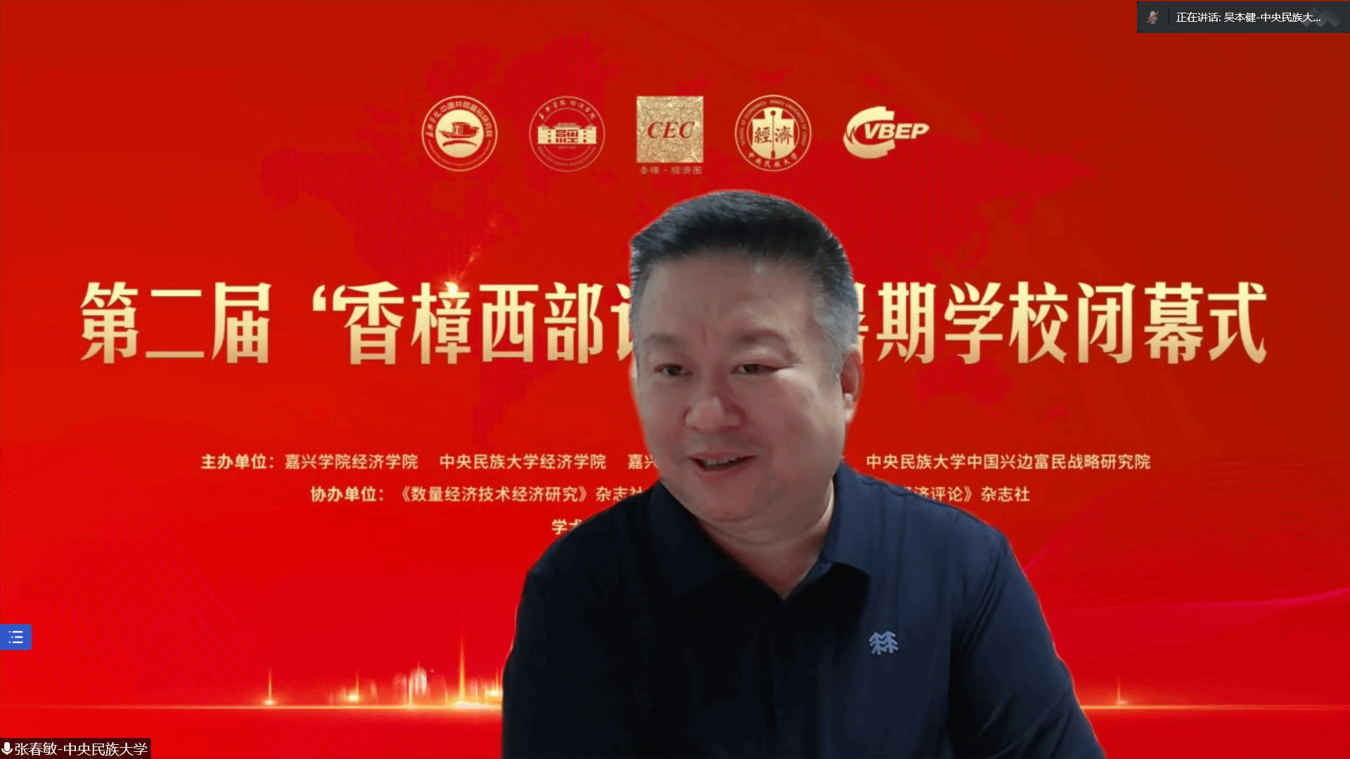 嘉兴学院文雁兵教授回顾了本届“香樟西部计划”,共举行6场特邀专家讲座、26场中青年学者讲座和1场师生交流会,圆满完成原定授课和学习计划,对第二届“香樟西部计划”的成功举办表示祝贺。文雁兵教授诚挚表达了三个感谢,一是感谢以郑世林老师为代表的中青年学者建立并发展了“香樟经济学术圈”这一致力于提供学术公共品平台,感谢“香樟学术圈”对该项活动的知识支持和学术保障。二是感谢中国社会科学院数量经济与技术经济研究所、中央民族大学william威廉中文官网和《中国经济学》《产业经济评论》编辑部的大力支持和通力配合,尤其是作为中国革命红船启航地高校的嘉兴学院和专门为我国民族和边疆地区培养优秀人才的中央民族大学的联合主办“香樟西部计划”,与办学和育人目标高度契合,有特殊的意义和独特的优势。三是感谢本届“香樟西部计划”的授课老师,来自中国社科院、北京大学、清华大学、中国人民大学、复旦大学、上海财经大学、南京大学、中山大学等国内顶级名校的顶级专家和学者克服各种困难,不遗余力地传授知识,是本届“香樟西部计划”圆满举办的重要原因。文雁兵教授表示,“香樟西部计划”将始终秉持“普惠共享、民族共荣、东西共进”的精神,汇聚卓越的师资力量和开展更多的有益活动,助力西部地区的学子成长成材,为国家助力培养一批卓越的西部青年经济学人,成为国家和西部地区发展的栋梁。
