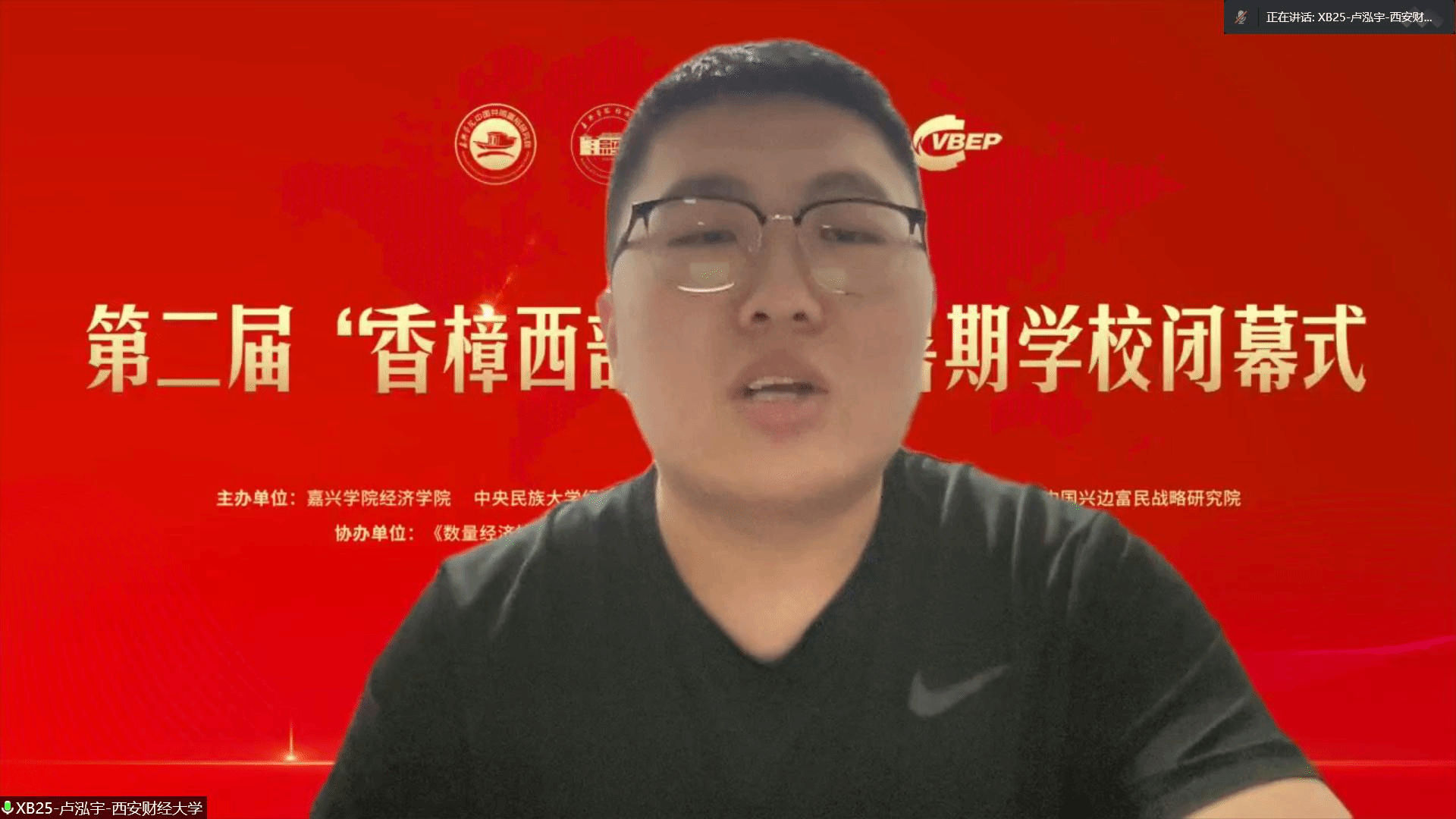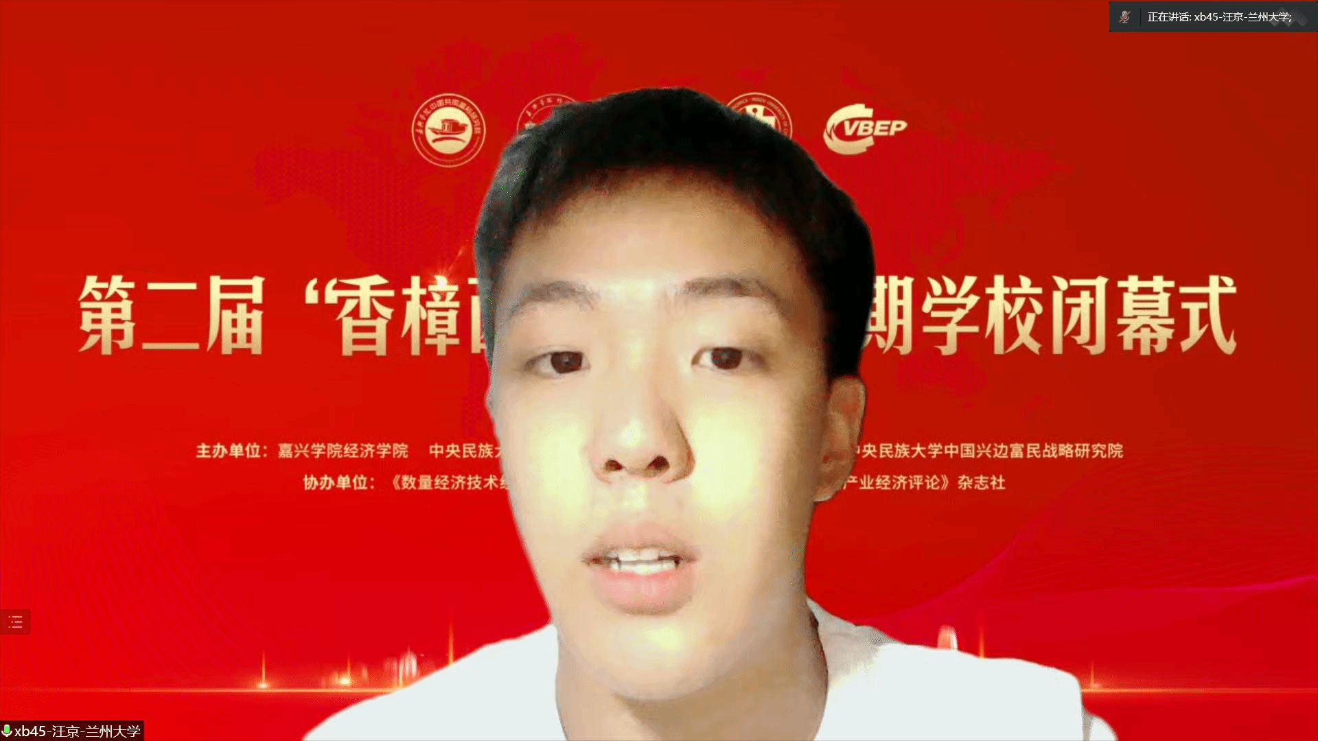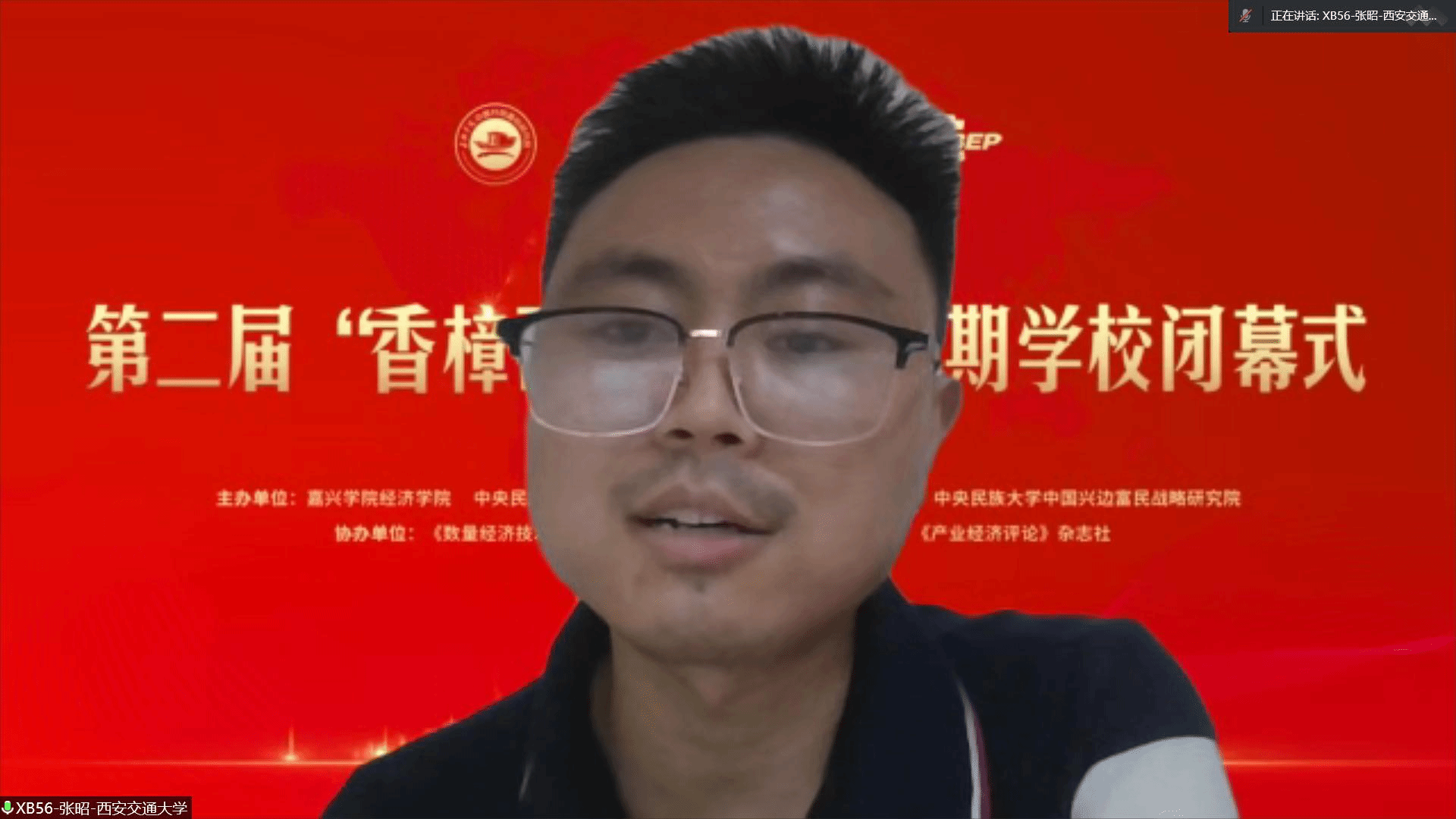 卢泓宇同学讲述了自己的学习经历,由于自己从工程管理跨专业到产业经济学,学术自信难以树立,随后通过不懈得学习与探索,才逐渐适应经济学的研究范式,暑期时间又有幸入选“香樟西部计划”,自己也十分珍惜这来之不易的学习机会。卢同学总结了自己参与此次香樟西部计划的所得:广交益友、学识延伸、思维升华。卢同学对“香樟西部计划”的办学提出两点建议:希望香樟平台可以将讲座或培训打造的更具特色,让更多研究领域的教师和同学参与进来;同时,还希望学员同各位老师达成长期的合作关系,而非一次性师生情谊,若各位老师将来有调研或实验项目需要学生参与,可以给予学员们一些机会等。最后,卢同学祝愿“香樟西部计划”越办越好,学员们产出更高质量的研究成果。
