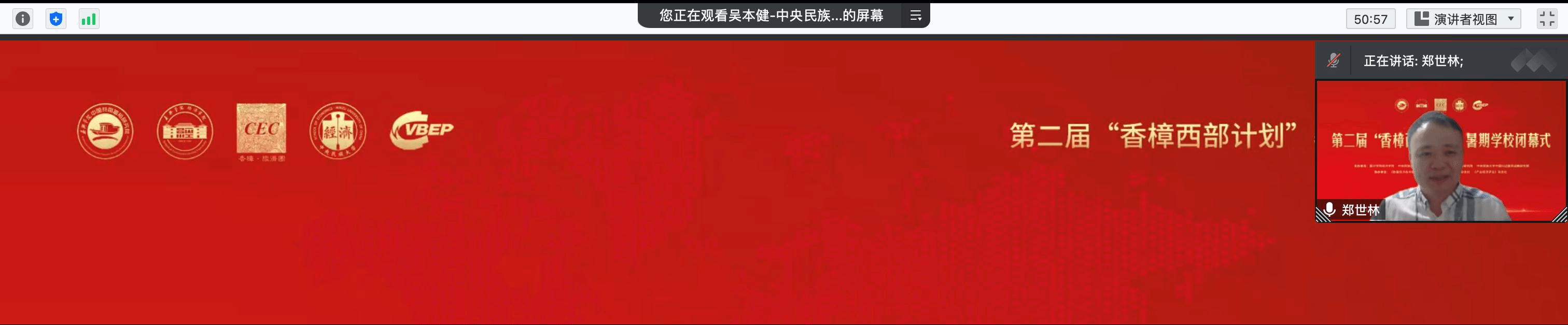 张春敏教授首先表达了诚挚的感谢,感谢香樟经济学术圈和授课老师们为同学们带来的一场场不同领域的学术盛宴,他们风格鲜明、观点独到,不仅有最新前沿的成果分享,还教导大家做学术需要保持初心。在感谢之余,张春敏教授表示,中央民族大学是一所服务首都并致力于西部发展的高校,参与“香樟西部计划”完全符合学校的办学理念。张春敏教授认为本次暑期班的开办,能够提升同学们的开放性、拓展思想的外部性、助力研究的学术规范性,通过思想传播,思想逐步转化为物质力量,从长远角度看,为促进共同富裕做出了贡献。张春敏教授希望同学们能够从西部发展的角度,扎根西部,为西部的发展贡献出自己的力量。最后张春敏教授向广大学员和授课老师们发出邀请,希望同学和老师能够来到中央民族大学进行交流和学习,未来也将持续为“香樟西部计划”提供支持和帮助,将“香樟西部计划”的影响力不断扩大,造福更多西部同学。