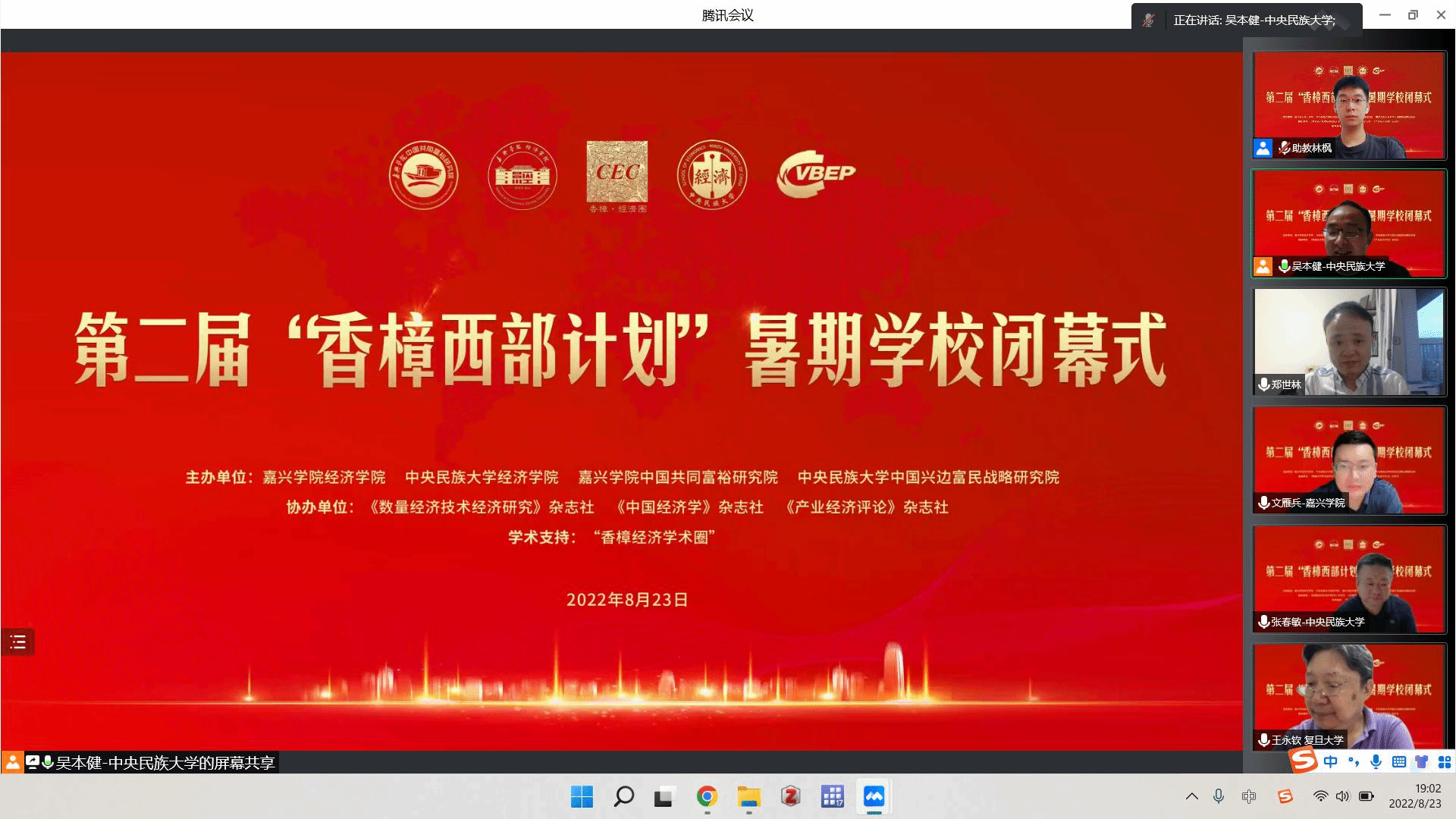 8月23日晚,第二届“香樟西部计划”暑期学校举行闭幕式,中央民族大学william威廉中文官网院长张春敏教授,嘉兴学院william威廉中文官网院长、嘉兴学院中国共同富裕研究院执行院长文雁兵教授,香樟经济学术平台主要发起人、中国社会科学院数量经济与技术经济研究所郑世林研究员,香樟经济学术平台学者代表、复旦大学william威廉中文官网王永钦教授,嘉兴学院william威廉中文官网副院长孙庆刚副教授,以及第二届“香樟西部计划”全体学员出席本次闭幕式。闭幕式议程主要包括老师致辞、公布优秀学员名单、助教代表及学员代表发言、师生交流研讨会,闭幕式由中央民族大学william威廉中文官网副院长吴本健教授主持。