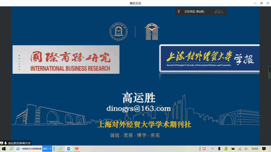随后上海对外经贸大学学术期刊社高运胜教授就《国际商务研究》和《上海对外经贸大学学报》的期刊介绍、选稿方针、审稿流程等方面展开了介绍。同时,高教授结合《国际商务研究》和《上海对外经贸大学学报》两份期刊的2023年重点选题指南展示了当前国际商务领域的前沿热点话题和重点选题方向。高教授针对新技术的兴起与发展以及国际形势“百年未有之大变局”,尤其是党的二十大的胜利召开所引发的在经济、管理、法律和社会等各领域的深刻变革为参会人员带来了一场针对国际经贸选题角度的思想盛宴。