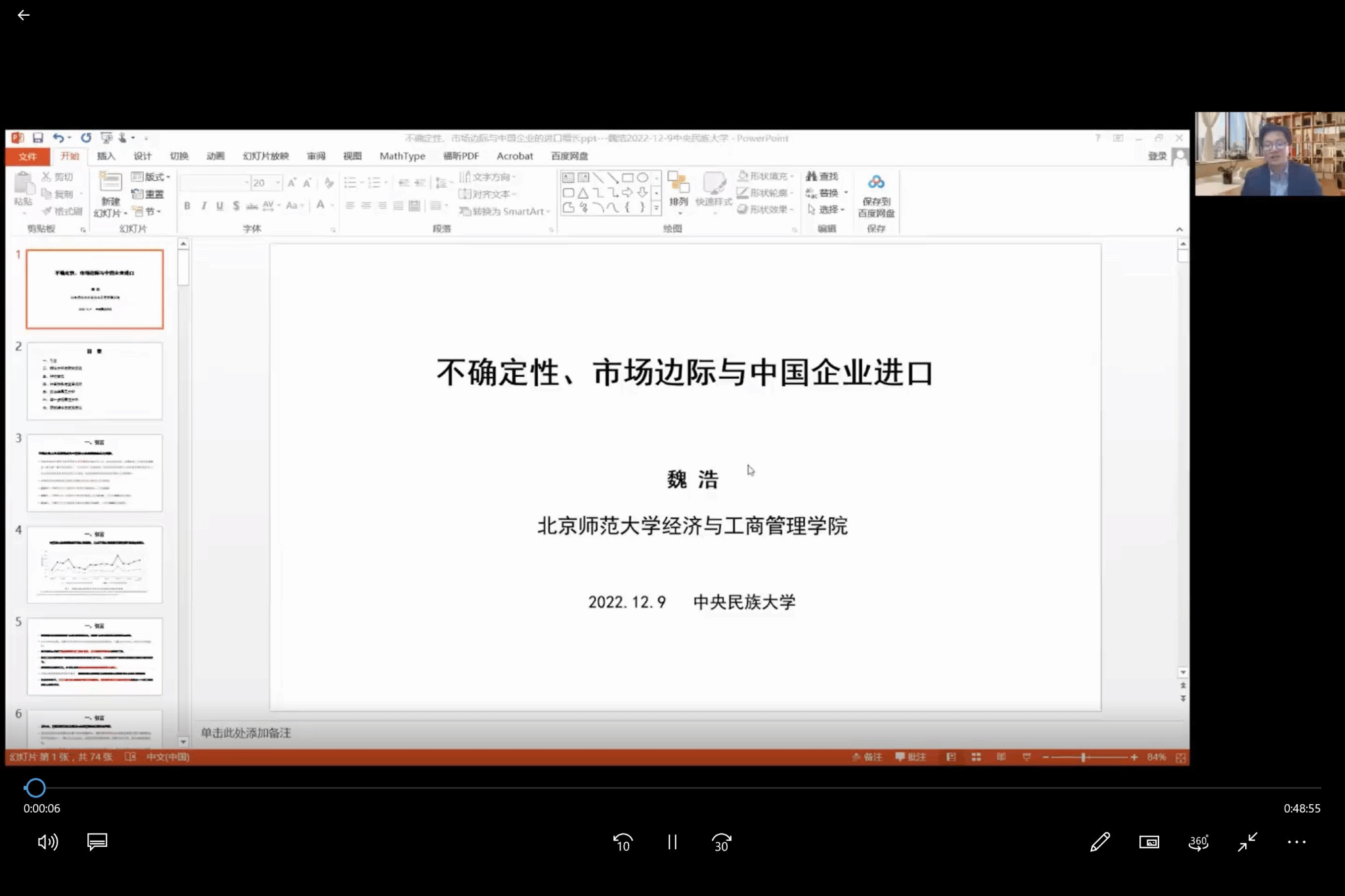 魏浩教授首先就“不确定性、市场边际与中国企业进口”进行了主题宣讲。宣讲从中国进口企业现阶段面临的最大风险——不确定性入手,探究不确定性影响企业进口增长的深层原因和机制。通过回归分析,论文发现不确定性增加反而促进了企业进口增长。持续进口市场和转换进口市场的贸易成本以及相应的供给冲击都发挥了显著的调节作用。实证表明,中国企业在面临外部不确定性时能够充分发挥能动性,调整进口市场组合,确保了进口稳定。论文提出了相应的政策建议。