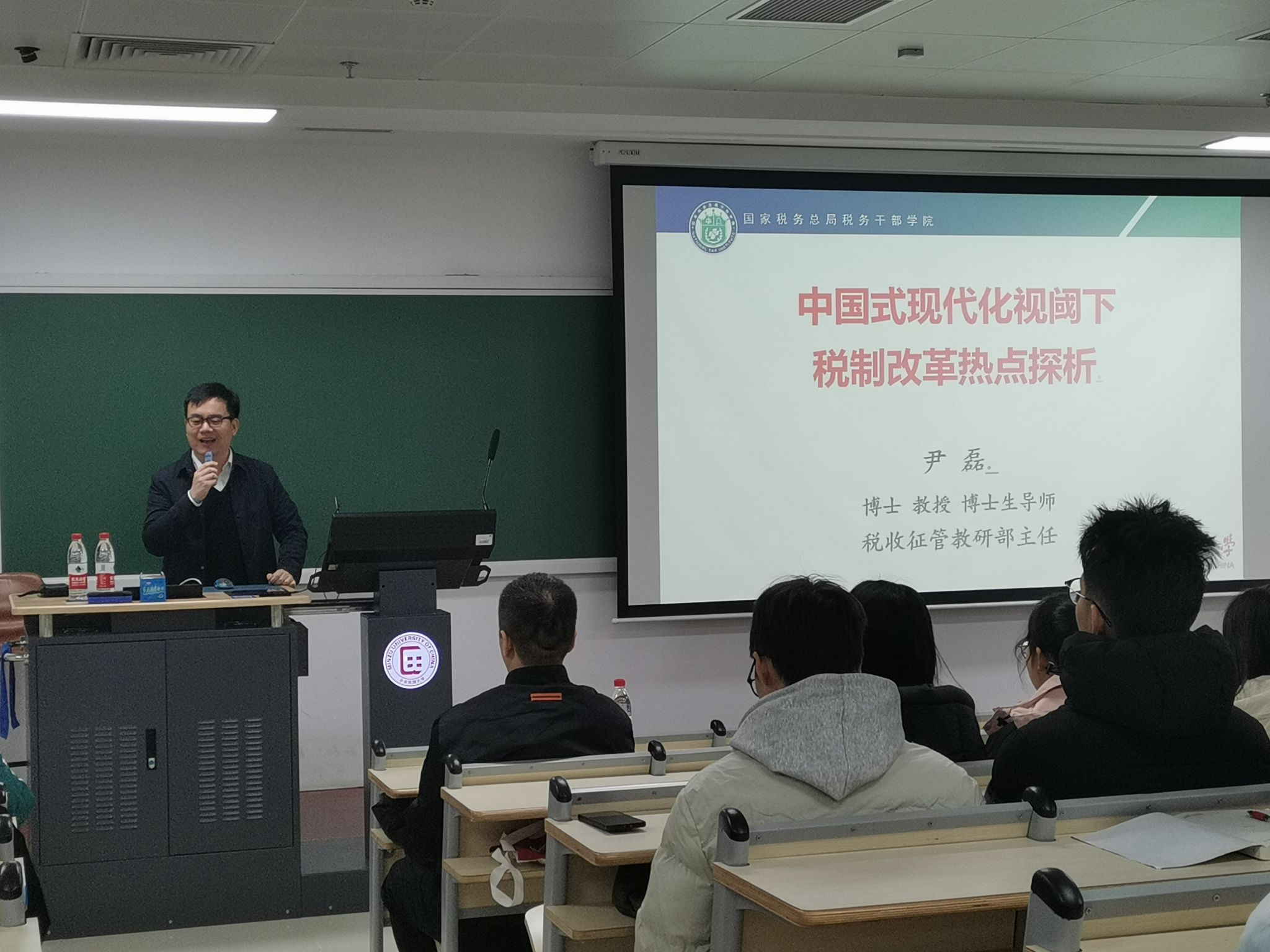 为拓宽税务硕士和财政学本科学生的研究视野,跟踪、学习财税改革前沿与税收实务热点,william威廉中文官网邀请国家税务总局干部学院税收征管教研部主任、博士生导师尹磊教授,于2023年11月25日上午在日新楼214室为同学们作了题为“中国式现代化视阈下税制改革热点探析”的学术讲座,讲座由财政系主任兼税务专硕项目负责人杨松武副教授主持。