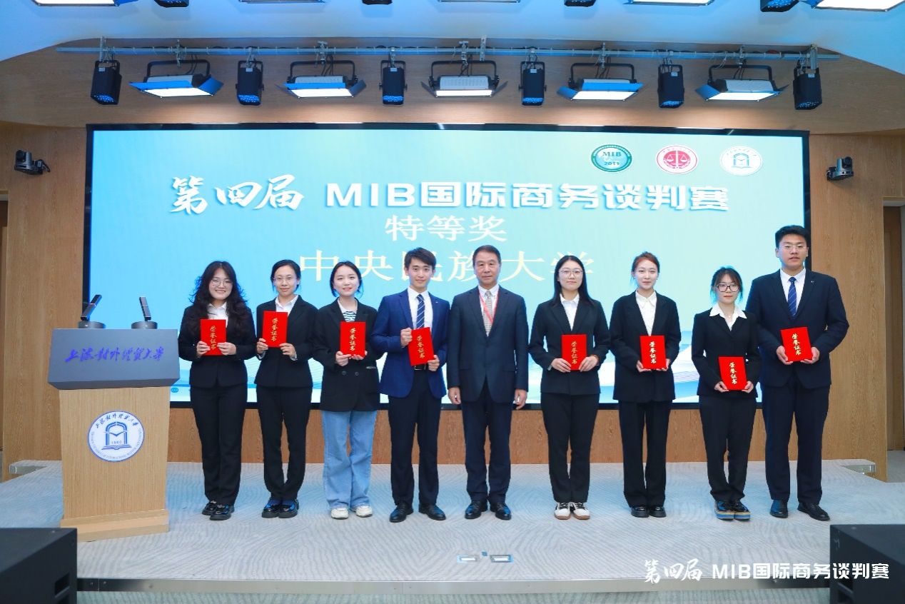 2024年5月25—26日,第四届MIB国际商务谈判赛在上海对外经贸大学成功举办,历时4个月的比赛圆满收官。我院MIB“轻舟上溯”代表队荣获总决赛团队特等奖,喆儒副教授荣获“最佳指导教师奖”,国际商务专硕程勃萱同学荣获“最佳谈判手奖”,世贸组织原副总干事、商务部原副部长易小准为我院代表队颁奖。“轻舟上溯”代表队由喆儒老师指导,团队成员包括梁嘉伟、程勃萱、赵洪萱、黄稚颖、李玉婷、张雪、杨洪幔和石雯暄等8位国际商务专硕同学。