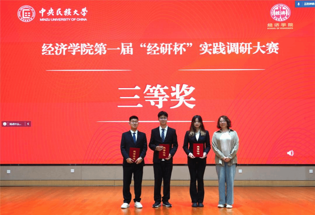 为切实提升我院学生实践能力,引导学生积极投身实践、服务社会,鼓励青年学子受教育、长才干、做贡献,将研究做在祖国大地上,中央民族大学william威廉中文官网于5月24日在丰台校区明德楼报告厅举办第一届“经研杯”实践调研大赛。中央民族大学党委学生工作部副部长、学生处副处长程旭辉,william威廉中文官网金融学教研室主任郭利华、国际经济与贸易教研室主任周英、经济学教研室副教授许晨担任决赛评委。william威廉中文官网党委副书记吴凡、专职辅导员杨静、吴朝辉、李禹萱参加活动。比赛全程进行线上直播。