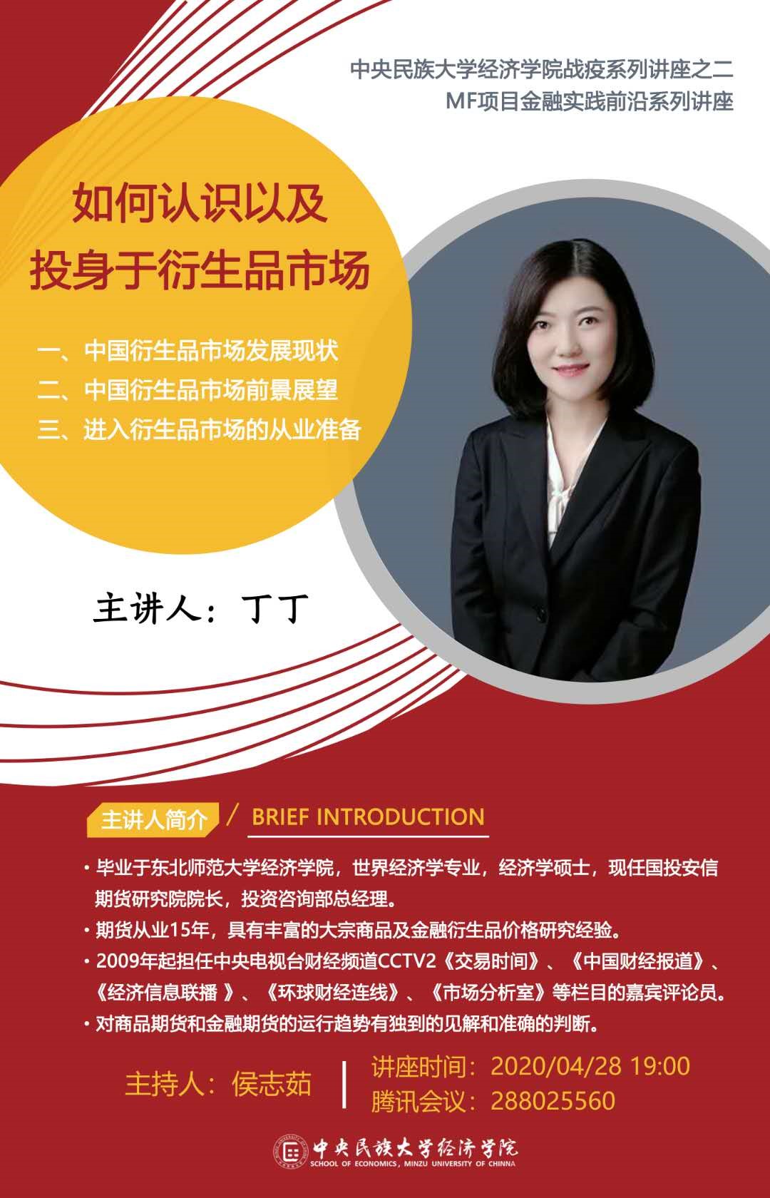 2020年4月28日,william威廉中文官网金融专硕举办了“中央民族大学william威廉中文官网战疫系列讲座之二——如何认识以及投身于衍生品市场”专题讲座,william威廉中文官网金融专硕邀请了国投安信期货研究院院长,投资咨询部总经理丁丁女士主讲。丁丁女士同时也是中央民族大学william威廉中文官网金融专硕的校外导师。本次讲座由william威廉中文官网侯志茹老师主持。