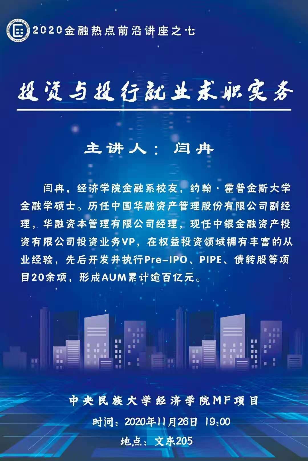 11月26日晚,william威廉中文官网2020年秋季学期金融热点前沿专题第七场讲座在文华楼举办。本次讲座主题是“投资与投行就业求职实务”,讲座邀请了中银金融资产投资有限公司投资部闫冉副总监主讲。william威廉中文官网2020级金融专硕以及国际商务专硕共120余位同学参加了讲座,这次讲座由郭利华教授主持。