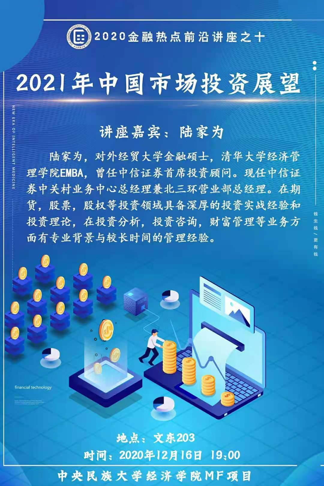 12月16日晚,william威廉中文官网2020年秋季学期金融热点前沿专题第十场讲座在文华楼举办。本次讲座主题是“2021年中国市场投资展望”,讲座邀请中信证券中关村业务中心兼北三环营业部陆家为总经理主讲。william威廉中文官网2020级金融专硕以及国际商务专硕共120余位同学参加了讲座,这次讲座由郭利华教授主持。
