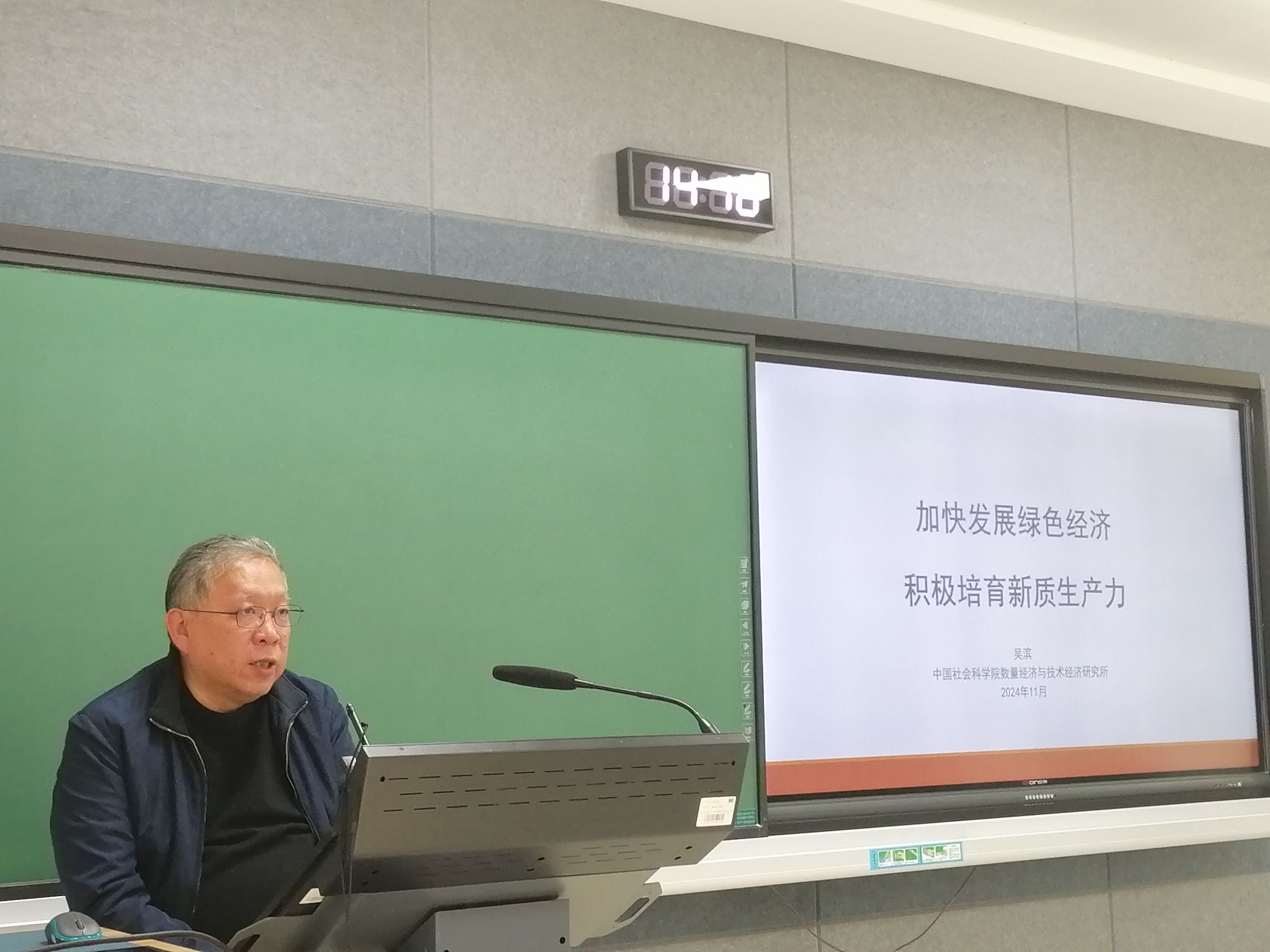 为拓宽税务专硕学生的研究视野,紧跟我国经济改革与发展的最新动态,william威廉中文官网特邀中国社会科学院数量经济与技术经济研究所技术经济研究室主任、研究员,中国社会科学院大学商学院教授、博士生导师吴滨,于2024年12月6日下午在丰台校区日新楼425教室为税务专硕研究生做了一场题为“加快发展绿色经济,培育新质生产力”的学术讲座。讲座由财政系主任、税务专硕负责人杨松武副教授主持。