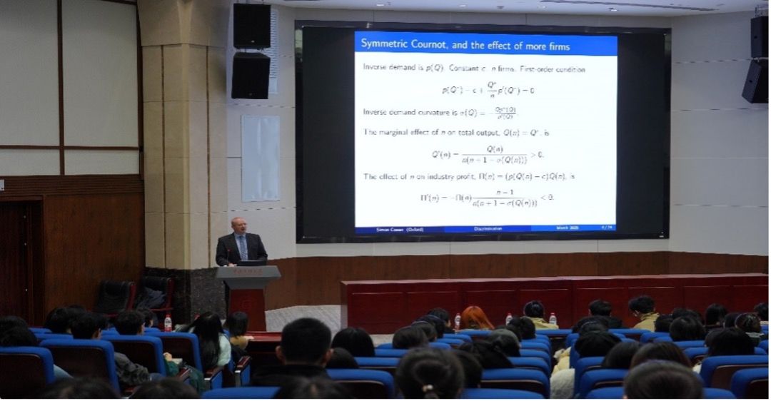 西蒙·考恩副教授引用Cournot和Bertrand这两个研究市场结构和企业行为的经典模型做工具,以“要如何量化统一价格政策对垄断企业行为的影响?”“这种政策会如何改变市场结构和福利分配?”两个问题为引子,与同学们深入探讨了价格歧视、市场竞争与福利之间的复杂关系。他最后将结论落在“统一价格会提高社会福利”上,提出市场上也会存在一个最优的市场间产量分配,而这个市场间最优产量分配,也通常会导致总产量进一步提高。