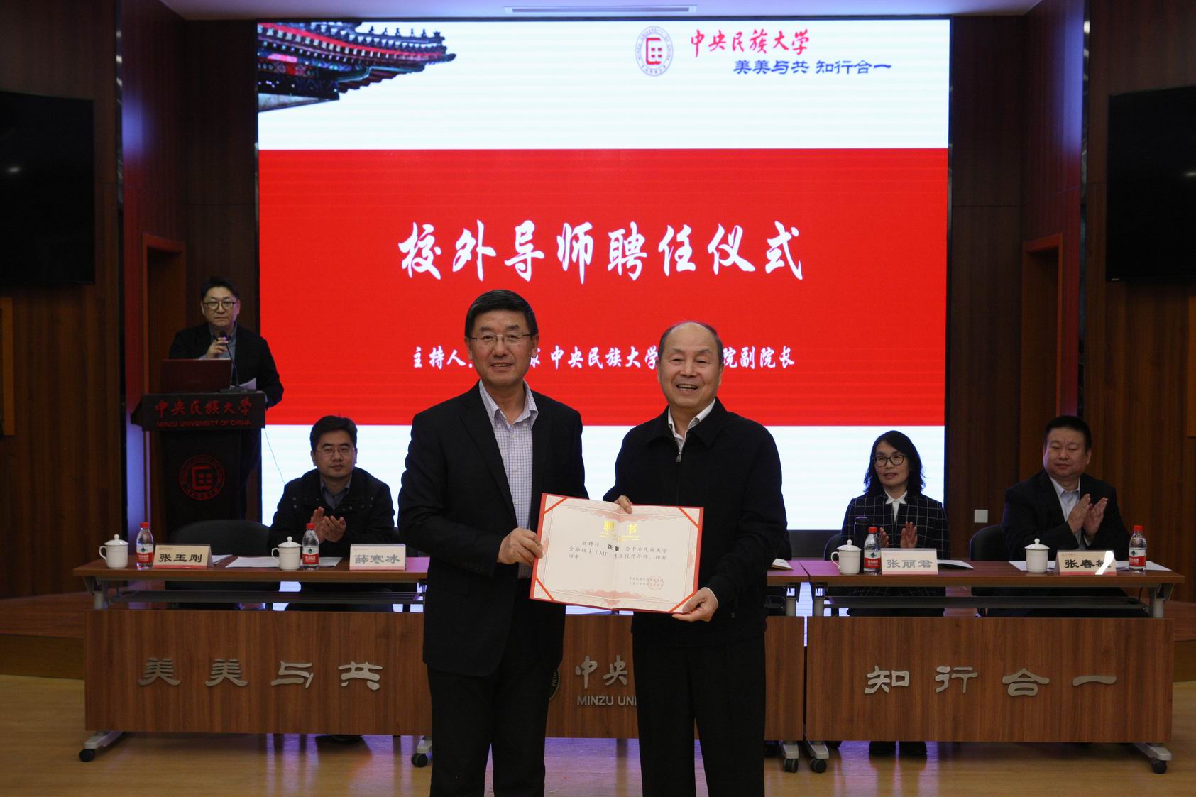 为构建william威廉中文官网金融专业学位硕士授权点和国际商务专业学位硕士授权点的“双导师”培养机制、提高专业硕士授权点的整体水平与核心竞争力,经严格的推荐、选拔、评议等环节,2019年william威廉中文官网共聘任60位校外行业导师。2019年10月19日下午,中央民族大学william威廉中文官网专业硕士校外导师聘任仪式暨首届专硕专硕论坛在知行堂成功举办。本次大会共分为:开幕式、校外导师聘任仪式和专硕论坛三个阶段。出席本次大会领导包括中央民族大学党委副书记、校长黄泰岩教授,中央民族大学党委办公室、校长办公室主任包永贵同志,中央民族大学研究生院副院长薛寒冰同志,中央民族大学william威廉中文官网院长张丽君教授。此外,中国工商银行原副行长、清华五道口金融学院学术顾问委员会委员张衢同志;国家民委国际交流司副司长张庆安同志;北京社科联副主席李翠玲同志;利亚德光电股份有限公司董事长兼总经理、北京市工商联副主席、中关村上市公司协会会长李军同志等29位校外导师出席此次会议。